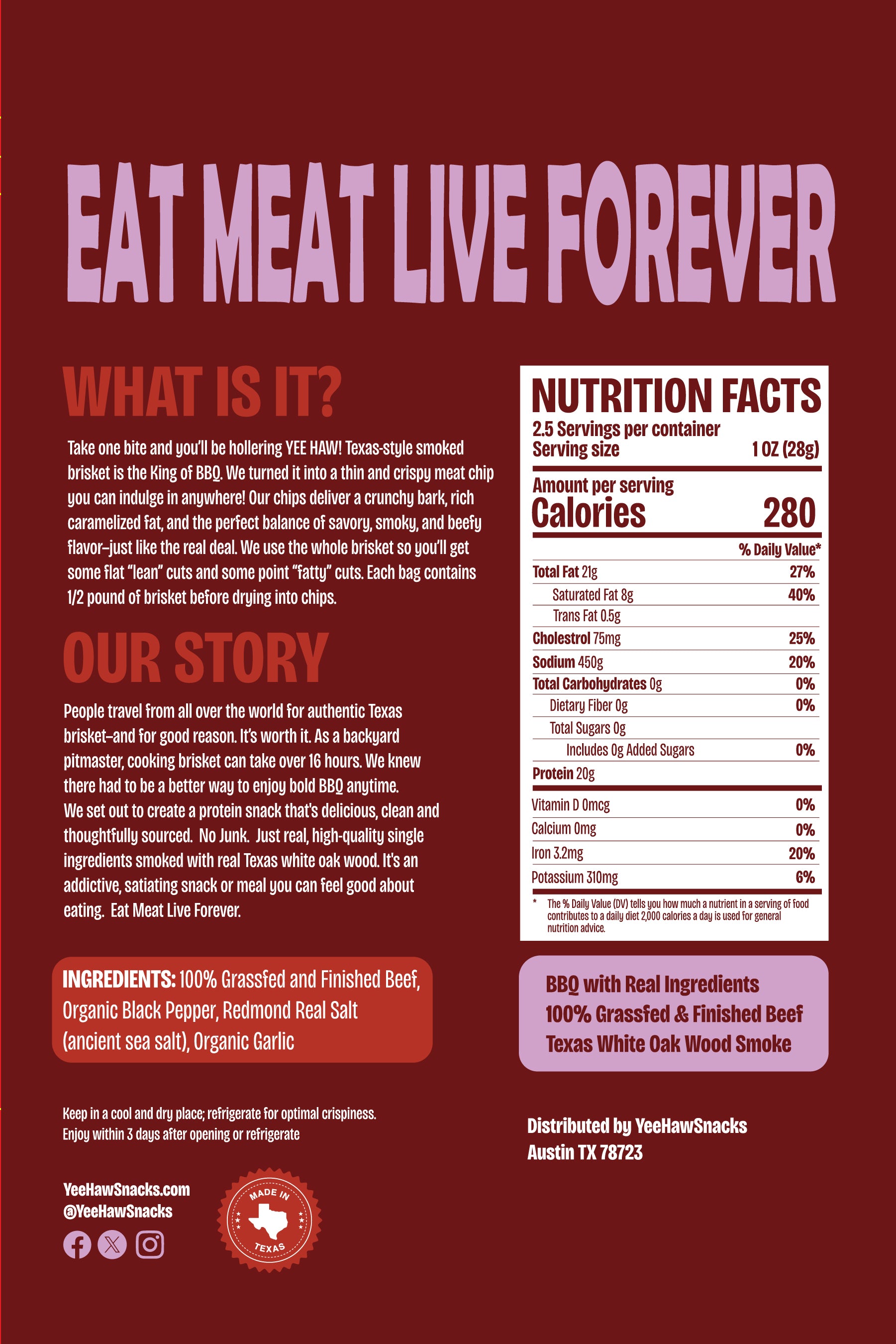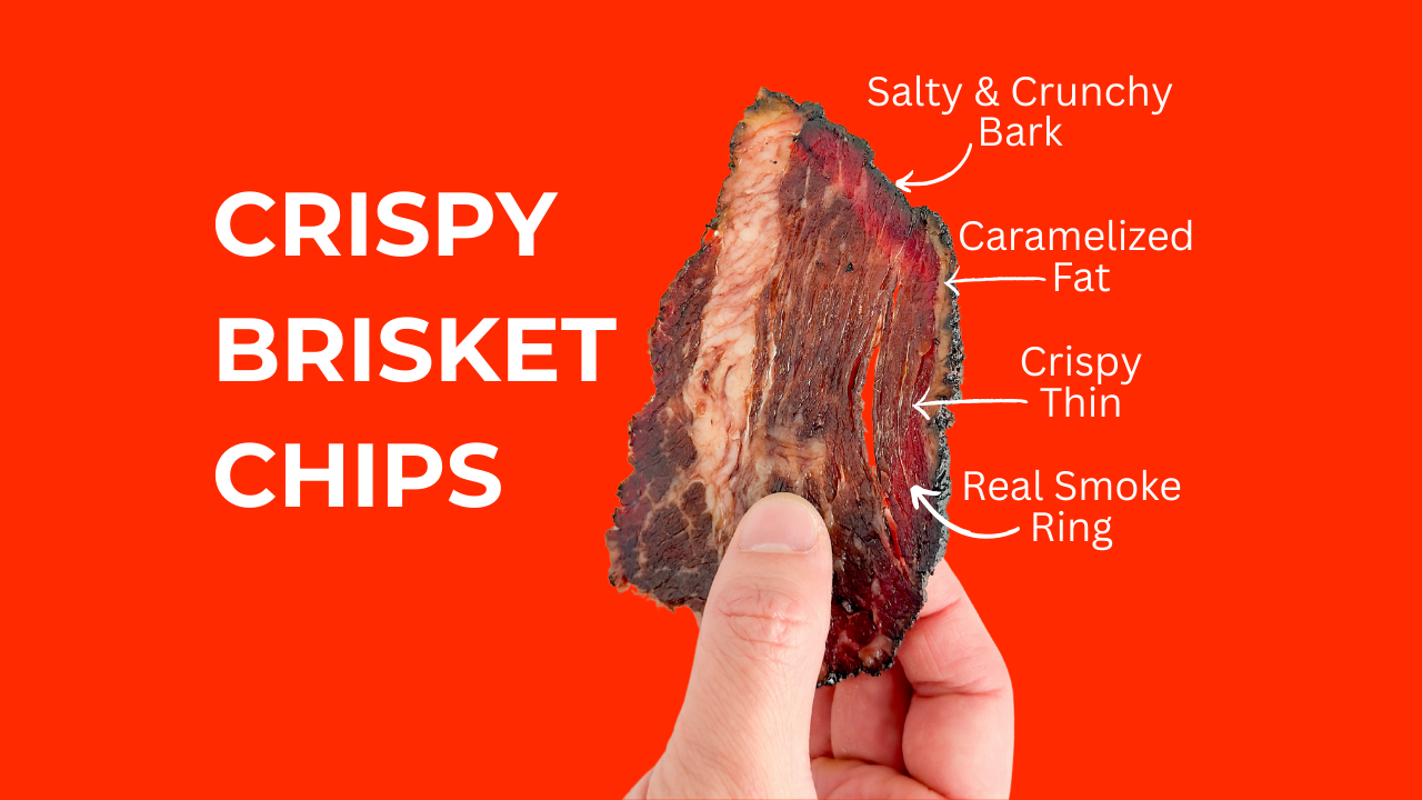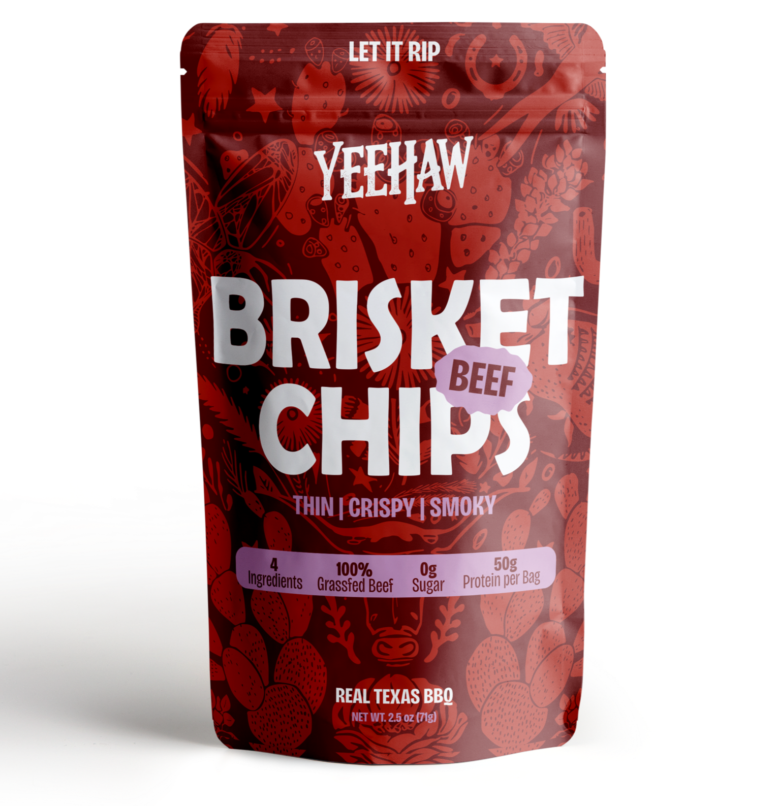 Crispy, thin, real Texas BBQ brisket chips. These high protein chips only have 4 ingredients; 100% grass fed & finished beef, Redmond Real Salt, organic black pepper, & organic garlic.